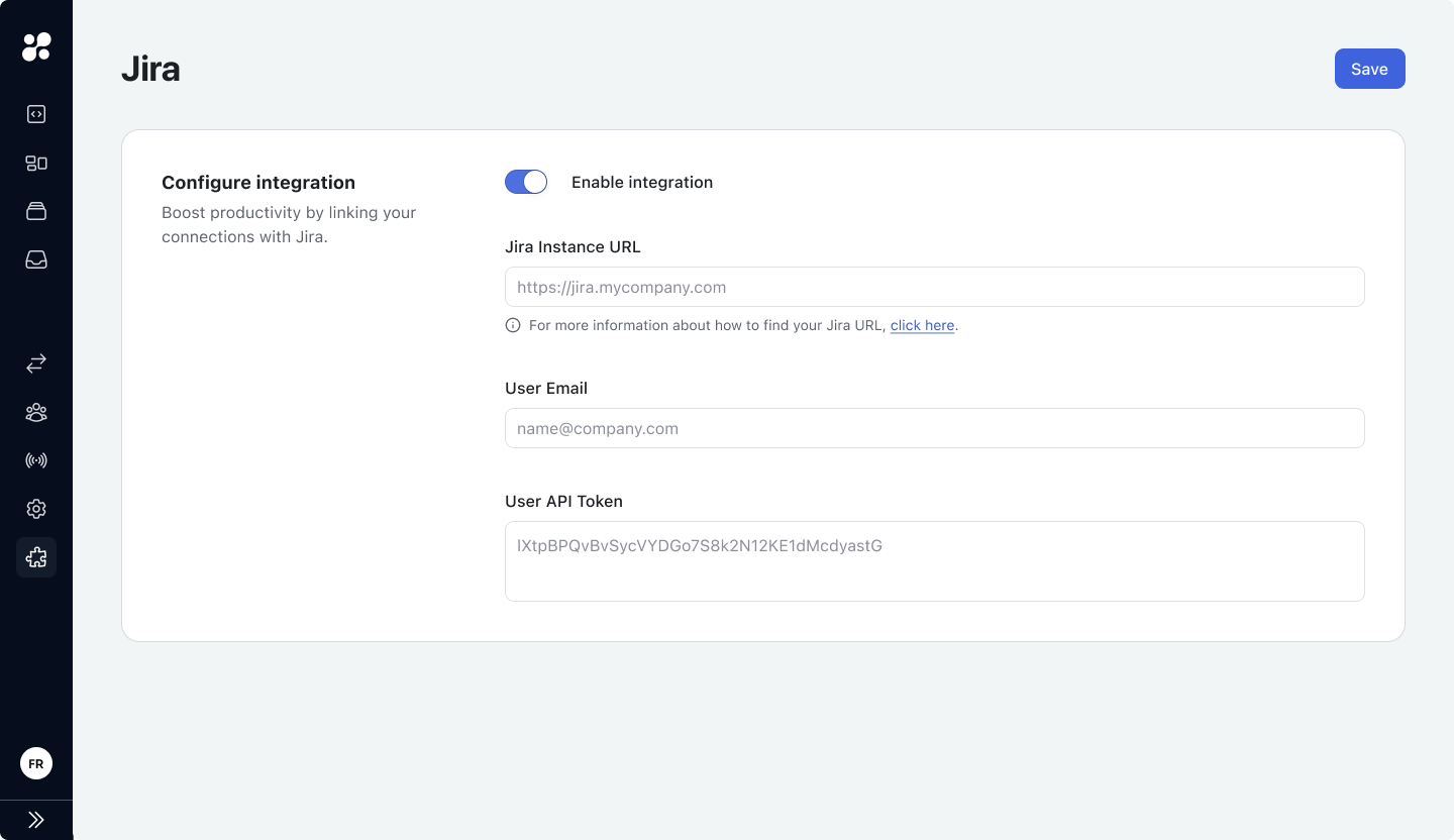 In the Integrations section (on the main sidebar), go to Jira and enable the integration to configure your credentials.