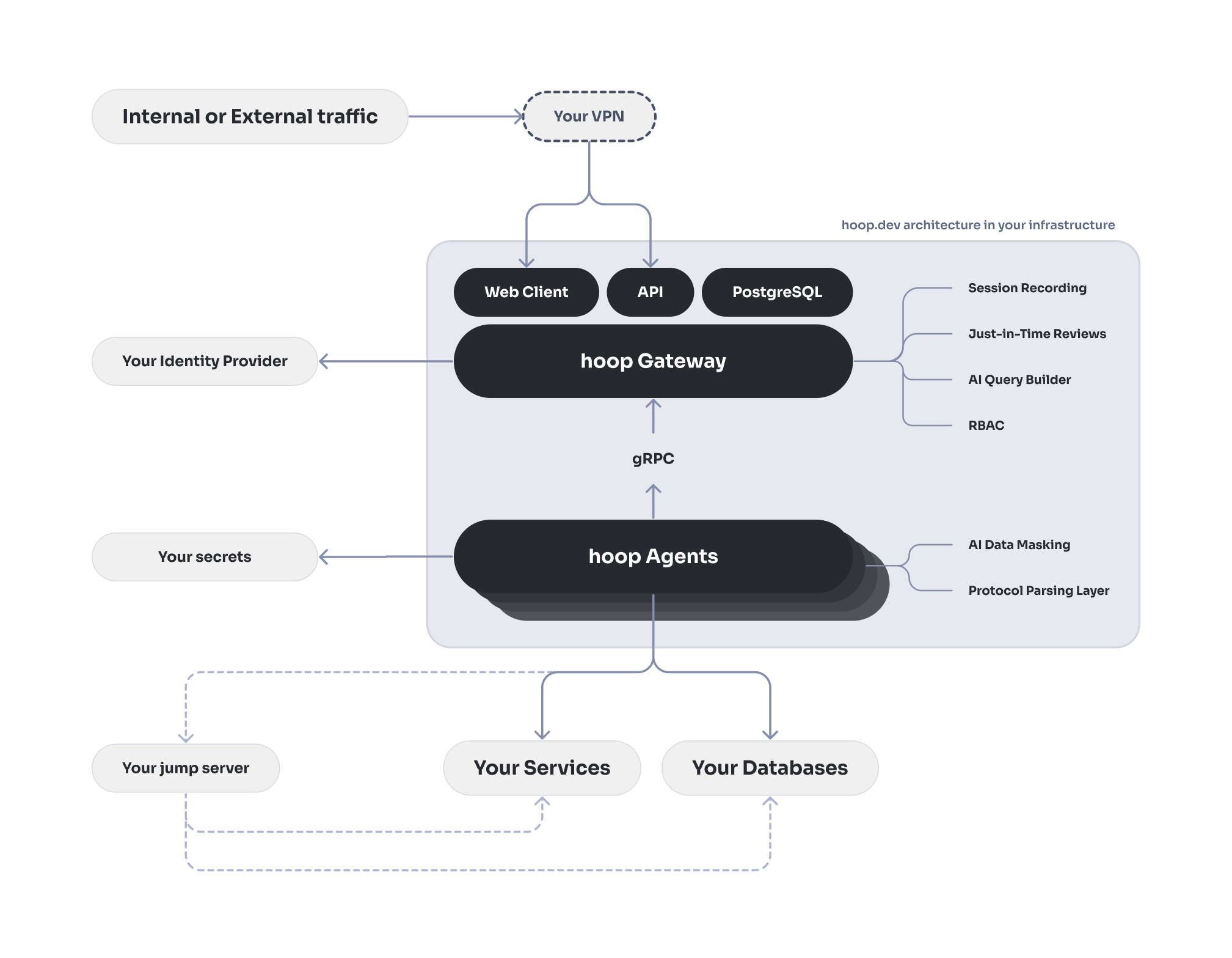 - hoop Agent: A lightweight agent that runs in your infrastructure and executes the operations you request. hoop.dev’s agent is responsible for running the operations in your infrastructure through a secure gRPC tunnel with the hoop Gateway;